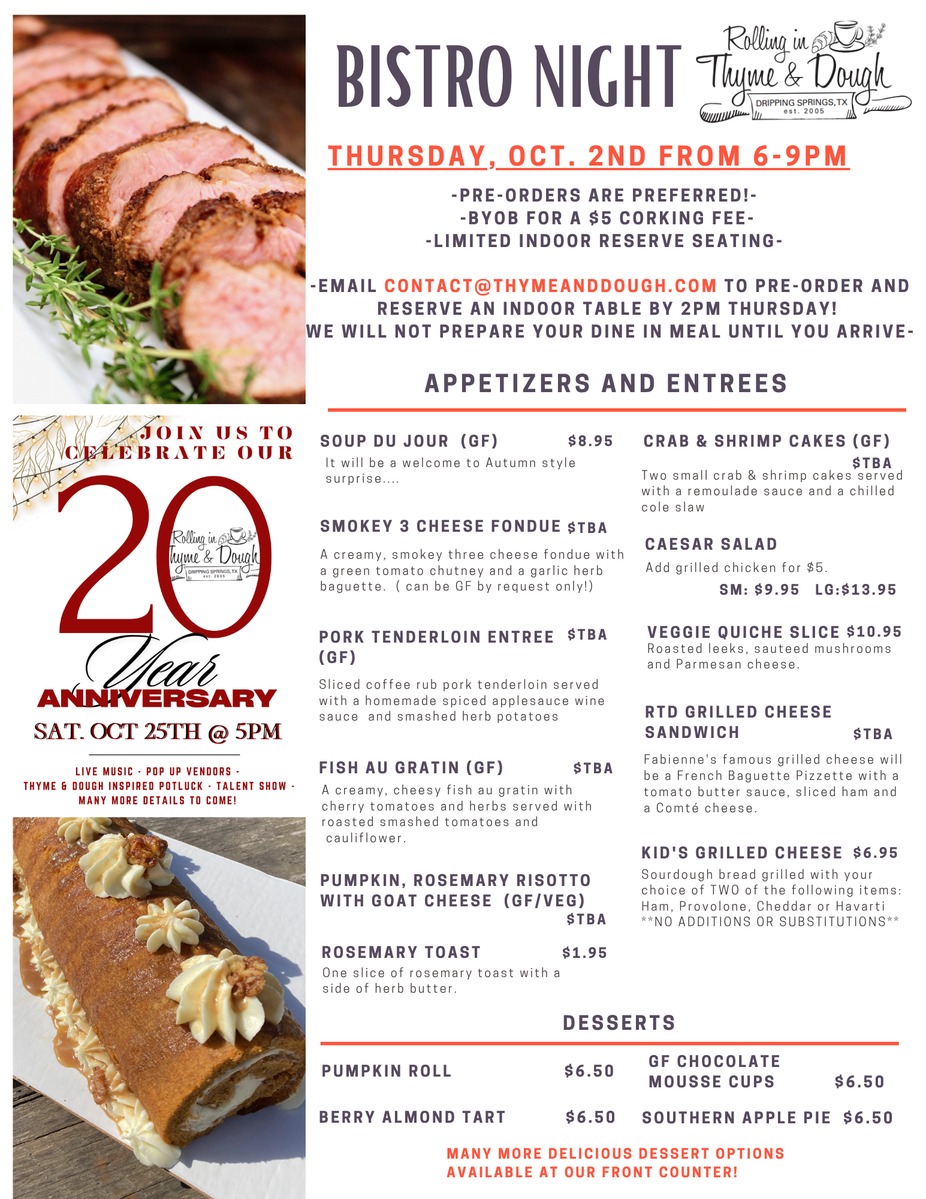 Bistro Nights will start back up in the Spring of 2024! Please subscribe to our email list to receive information on Bistro Nights and all our other events!