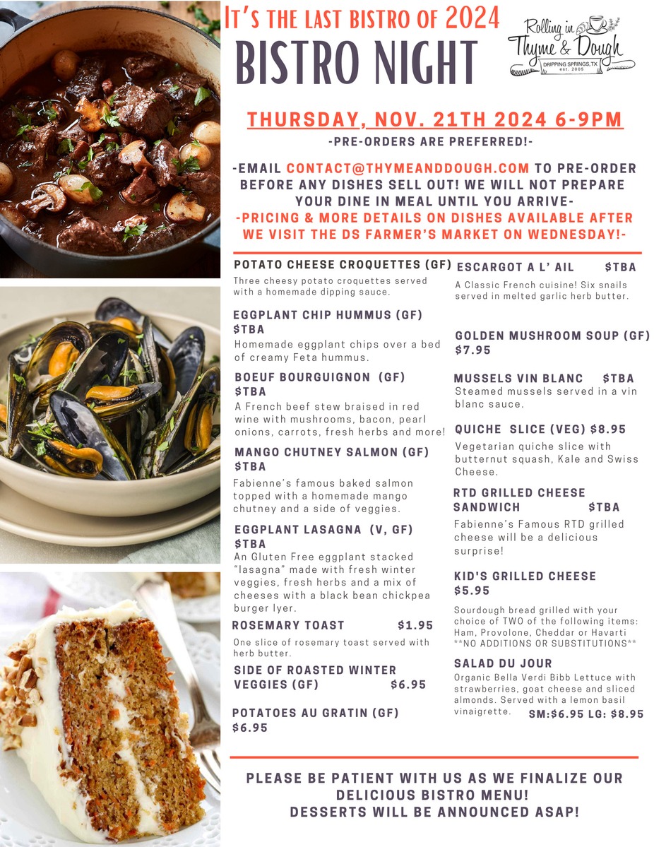 Bistro Nights will start back up in the Spring of 2024! Please subscribe to our email list to receive information on Bistro Nights and all our other events!